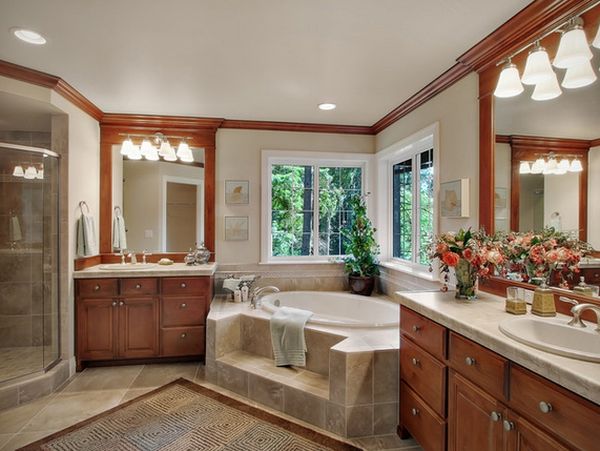 Bồn tắm được đặt trong góc phòng, ngay góc cửa sổ cung cấp một cái nhìn tuyệt vời ra phía ngoài.