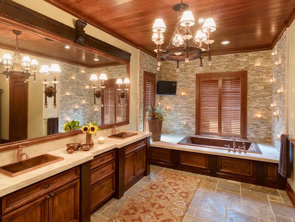 Không gian lãng mạn trong phòng tắm với sự kết hợp ấm áp của trần gỗ với tường đá, sự huyền ảo lung linh của ngọn đèn chùm được phản ánh trong gương.