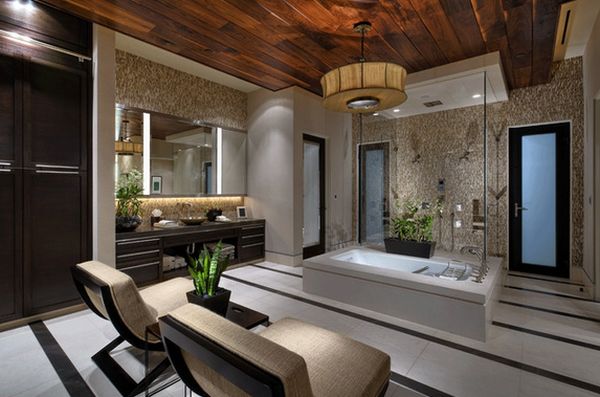 Trần bằng gỗ phong cách và ấm áp cho phòng tắm, bạn có thể trồng thêm cây xanh mang lại sức sống và sự tươi mát.